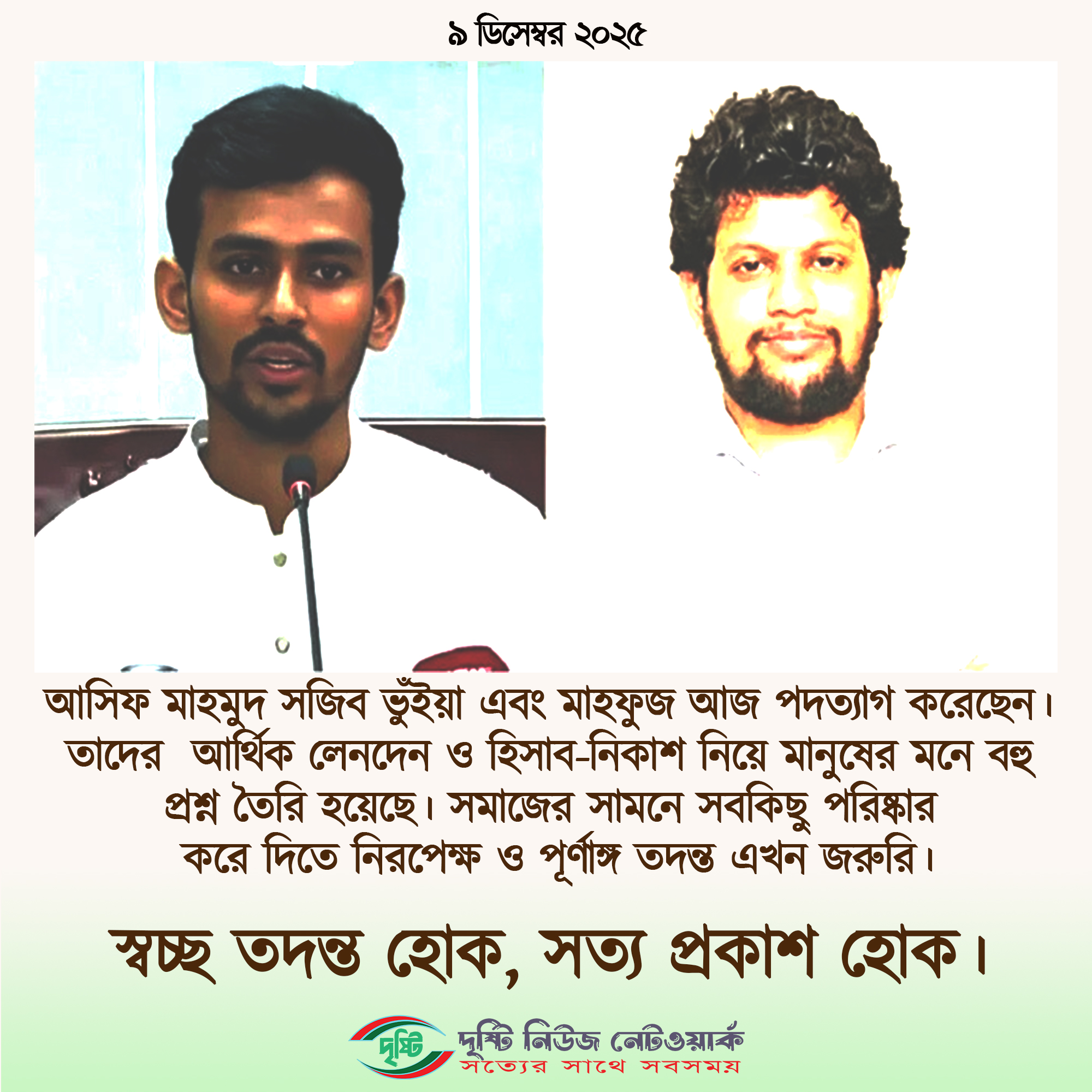 আসিফ মাহমুদ সজিব ভুঁইয়া এবং মাহফুজ আজ পদত্যাগ করেছেন। তাদের আর্থিক লেনদেন ও হিসাব-নিকাশ নিয়ে মানুষের মনে বহু প্রশ্ন তৈরি হয়েছে। সমাজের সামনে সবকিছু পরিষ্কার করে দিতে নিরপেক্ষ ও পূর্ণাঙ্গ তদন্ত এখন জরুরি।