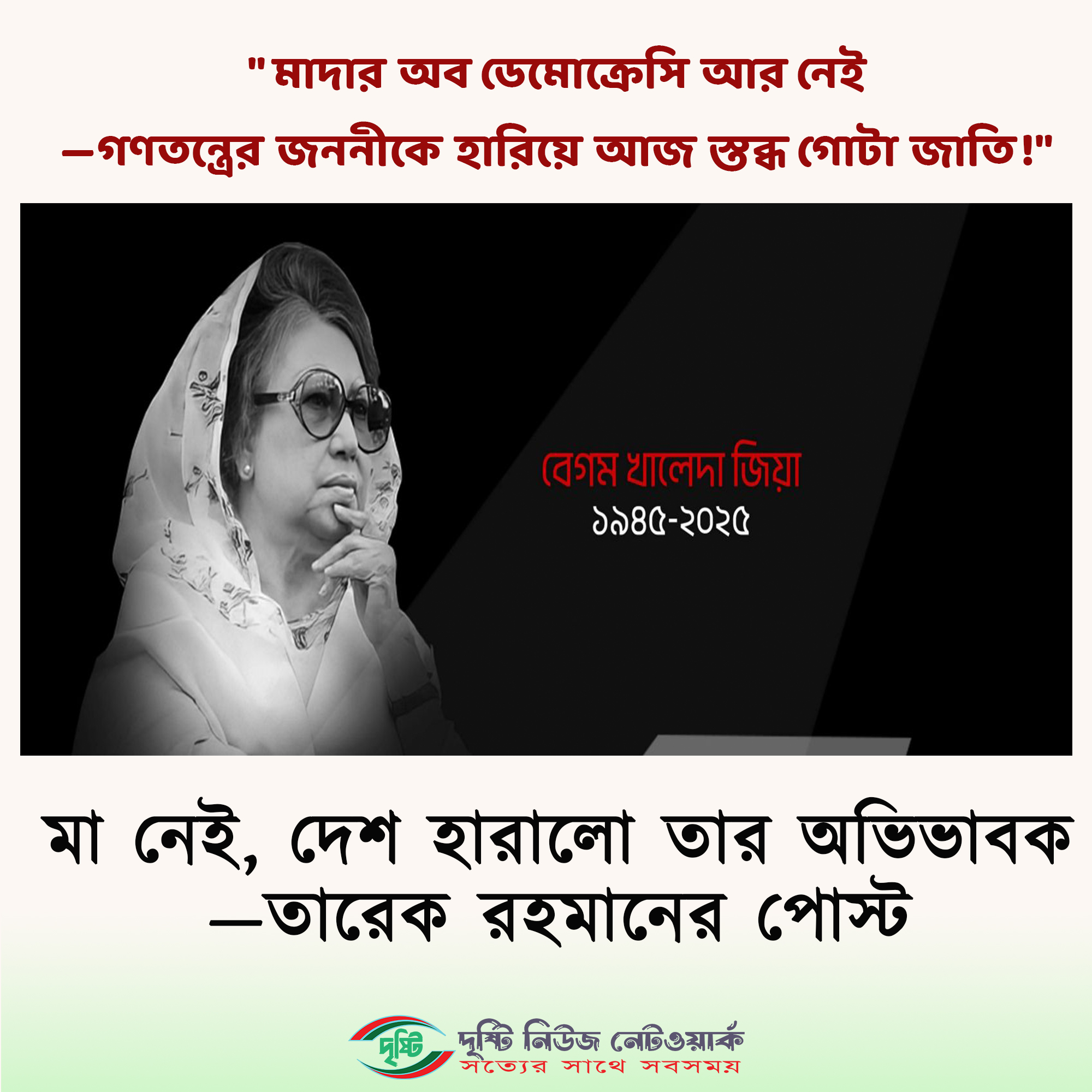 ‘দেশের জন্য তিনি হারিয়েছেন স্বামী, হারিয়েছেন সন্তান। তাই এই দেশ, এই দেশের মানুষই ছিল তার পরিবার, তার সত্তা, তার অস্তিত্ব। তিনি রেখে গেছেন জনসেবা, ত্যাগ ও সংগ্রামের এক অবিস্মরণীয় ইতিহাস, যা বাংলাদেশের গণতান্ত্রিক পরিক্রমায় চিরস্মরণীয় হয়ে থাকবে।’