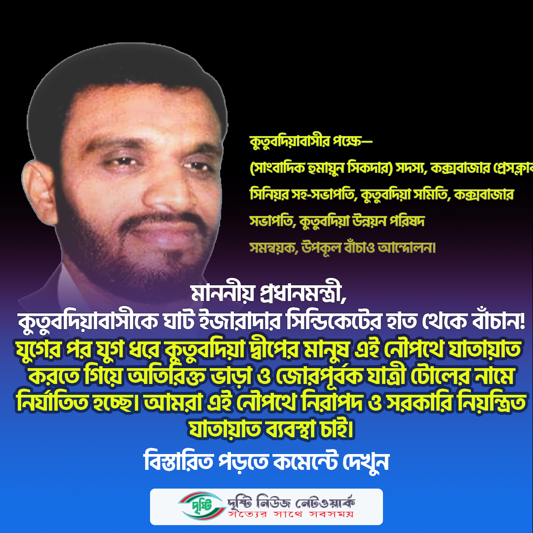 আমরা দ্বীপবাসীরা বিশ্বাস করি আপনার নেতৃত্বেই দেশের অবহেলিত অঞ্চলের মানুষ ন্যায়, সমতা ও সুবিধা পাচ্ছে। কুতুবদিয়া-মগনামা নৌপথে যাত্রী টোল আদায় একটি বৈষম্যমূলক ও মানবিকভাবে অগ্রহণযোগ্য প্রথা, যা অবিলম্বে বন্ধ হলে সাধারণ মানুষ স্বস্তি ও নিরাপত্তা ফিরে পাবে।