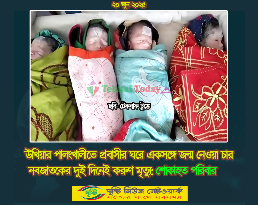 কক্সবাজার, ২০ জুন ২০২৫: কক্সবাজারের উখিয়া উপজেলার পালংখালী ইউনিয়নের মোছারখোলা এলাকায় প্রবাসী রবিউল আলমের ঘরে একসঙ্গে জন্ম নেওয়া চার নবজাতকই মাত্র দুই দিনের ব্যবধানে মারা গেছে। মঙ্গলবার (১৭ জুন) দুপুরে চার শিশুর আগমনে পরিবারে যে আনন্দের ঢেউ উঠেছিল, বৃহস্পতিবার (১৯ জুন) ভোররাতে তা শোকের সাগরে পরিণত হয়। এই হৃদয়বিদারক ঘটনায় রবিউল আলমের পরিবারজুড়ে নেমে এসেছে গভীর শোকের ছায়া।