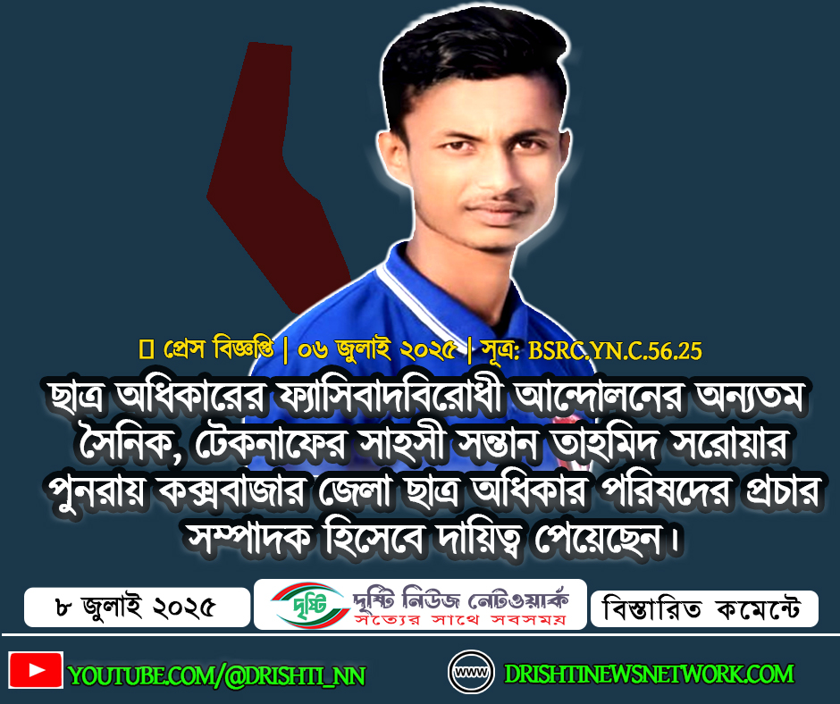 ছাত্র অধিকারের ফ্যাসিবাদবিরোধী আন্দোলনের অন্যতম সৈনিক, টেকনাফের সাহসী ছাত্রনেতা তাহমিদ সরোয়ার পুনরায় কক্সবাজার জেলা ছাত্র অধিকার পরিষদের প্রচার সম্পাদক হিসেবে দায়িত্ব পেয়েছেন।